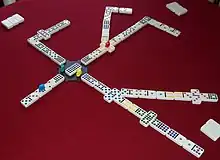 A game played with numbered dominoes, in which each player attempts to to play all of his/her dominoes onto one or more chains, or "trains", emanating from a central hub or "station".