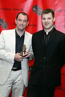 Trey Parker, holding a Peabody Award, and Matt Stone