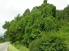 Pueraria montana var. lobata overwhelming roadside trees and shrubs in Montana