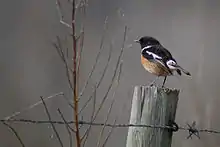 - (genus): Saxicola rubetra (whinchat), Saxicola macrorhynchus (white-browed bush chat), Saxicola insignis (white-throated bush chat), Saxicola dacotiae (Canary Islands stonechat), Saxicola rubicola (European stonechat), Saxicola maurus (Siberian stonechat), Saxicola stejnegeri (Amur stonechat), Saxicola torquatus (African stonechat), Saxicola sibilla (Madagascar stonechat), Saxicola tectes (Reunion stonechat), Saxicola leucurus (white-tailed stonechat), Saxicola caprata (pied bush chat), Saxicola jerdoni (Jerdon's bush chat), Saxicola ferreus (grey bush chat), Saxicola gutturalis (white-bellied bush chat) - species
