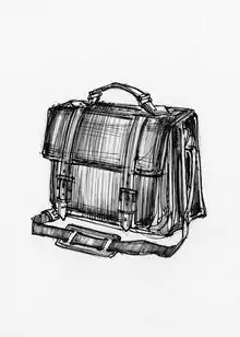 - schoolbag, rectangular satchel employed to carry utilities to an education institution