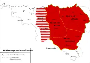 sensu stricto Walloon-speaking area including the small politically French "peninsula" of Givet (red) and boundaries of Wallonia; the inhabitants of both are called "Walloons"; people in North-East area (cut) are German-speaking Walloons