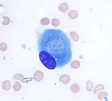 an osteoblast among RBCs, rendered with the Wright-Giemsa stain
