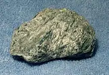 - (mineralogy) A mineral with monoclinic crystals of the chemical formula Ca2(Mg,Fe)5Si8O22(OH)2, belonging to the amphibole group.