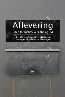 "Aflevering". Hand-in of books to a Danish library outside opening hours.