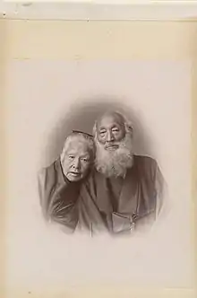 A photographic portrait of an ageful, or elderly, Japanese couple by Adolfo Farsari (1841–1898), an Italian photographer who owned a photographic studio in Yokohama, Japan