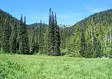 - glade (grassy open or cleared space in a forest, especially one that is a result of slash-and-burn cultivation)