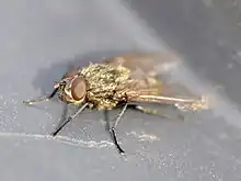 - The eyes of the male are separated by a distance equal to one-fourth of the diameter of the head, in the female by one-third. The frontal stripe is black, the cheeks and margins of the orbits silvery-white. The antennæ are black, the arista feathered on the upper side only.