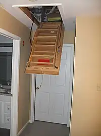 - (countable) A usually retractable ladder used to access an attic through an attic door.