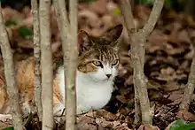 Katua adarren atzean dago (the cat is behind the branches).