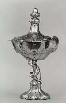 Standing Cup with Cover[1] (c. 1639) by Dutch silver-smith Johannes Lutma (1584?–1669), whose work is exemplary of the auricular style. This particular work typifies the auricular style in the flowing shapes Lutma has carved into the gilded silver.