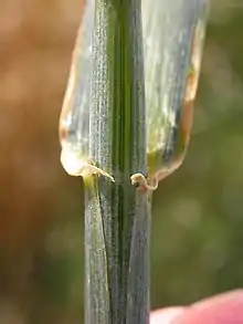 The leaves of wheat are auriculate; there is an auricle at each side where the lamina and sheath of the leaf join.