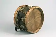 - drum (percussive musical instrument spanned with a thin covering on at least one end for striking, forming an acoustic chamber)