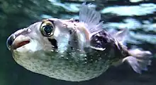 - blowfish; porcupinefish (any species of fish in the order Tetraodontiformes that have the ability to inflate themselves to a globe)