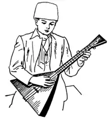 - A plucked stringed instrument with a triangular body, short neck and three strings, of Russian origin.