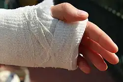 - (medicine) a bandage (a strip of gauze or similar material used to protect or support a wound or injury)