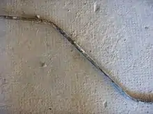 - bar, rod (a solid, more or less rigid object of metal or other material with a uniform cross-section smaller than its length)