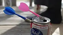 - A drinking game in which players place a beer can by their feet and take turns trying to hit their opponent's can with darts.