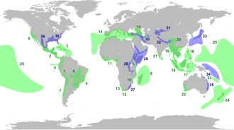 A map of the world’s biodiversity hotspots as of July 2010. The regions in green were identified by Norman Myers et al. in their 2000 article in Nature (see the quotation), while those in blue have been identified since then.