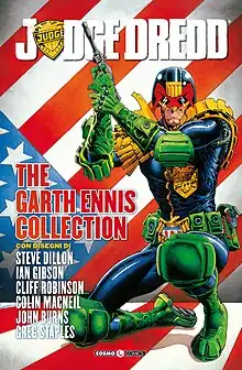 Judge Dredd har en mycket bister min (a very bister facial expression)
