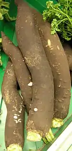 - A root vegetable of the family Brassicaceae cultivated for its edible root that has a tough black or dull brown skin and white flesh, Raphanus sativus var. niger