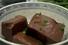 1. A food product made of coagulated animal blood, used in various Asian cuisines.