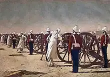 A depiction of mutinous Indian soldiers about to be executed by blowing from guns following the Indian Rebellion of 1857.