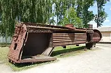 A boiler with its outer casing removed, exposing the boiler tubes.