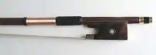 - (music, lutherie) The small section of a stringed instrument's bow near the heel having grippy material such as goatskin leather or snakeskin wrapped tightly around the bow stick between the lapping and the frog, so as to facilitate it being held and to protect the stick.