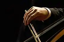 - (music) The refined and precise manner of holding the bow of a bowed string instrument.