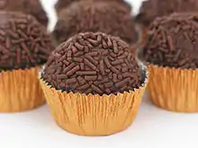 - (cooking) a traditional Brazilian chocolate truffle made from condensed milk, cocoa powder and either butter or margarine, rolled into a small ball and cooked, traditionally covered with chocolate sprinkles and served in a small paper cup
