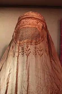 - A Central Asian garment that covers the whole body, which has a net screen covering the eyes so they cannot be seen, and is worn by women.