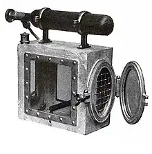 A canary cage for use in mines. The handle is an oxygen cylinder that can be used to revive the canary.