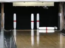 - (bowling) A kind of cylindrical tenpin used in a North American regional form of bowling.