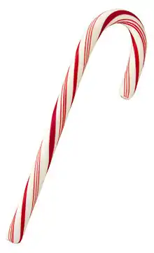 - (US, Canada) An edible candy in the shape of a cane or staff, generally consumed during Christmas time and usually having a peppermint flavor.