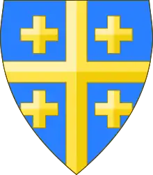 Azur, a cross Or, cantoned of four crosslets of the same.