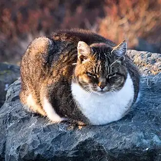 - (slang) The loaflike form of a domestic cat in which it sits with its paws and tail tucked underneath its body.