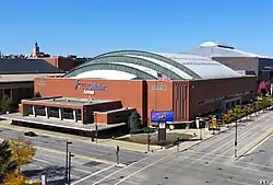 A photograph of a US stadium taken from a catty-corner parking lot, located diagonally across the adjacent intersection