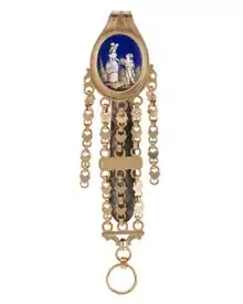 - The Swiss jewellery chiefly consisted of châtelaines or watch pendants, having no very distinct style or character, but embracing examples of all styles, both ancient and modern; […] One of the chief attractions in the collection were the examples of châtelaines attached to watch cases, ornamented in a similar style.