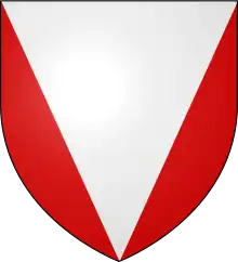 - (heraldry) Divided into three with two lines from the corners of the chief to the point in base.