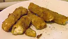 - An elongated piece of battered or breaded cheese, such as a mozzarella stick.