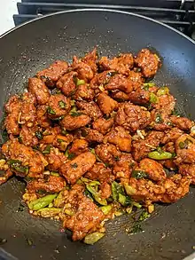 - (India) An Indo-Chinese dish consisting of deep-fried chicken and red chillies.