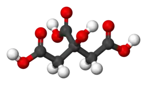 - (organic chemistry) A colourless crystalline compound, 2-hydroxy-1,2,3-propanetricarboxylic acid, C6H8O7, found in citrus fruit; it is used as a food additive and in the manufacture of citrates.