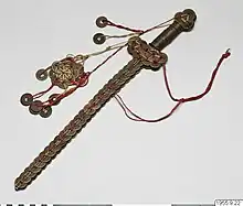 A Chinese coin sword-shaped talisman made from Qing dynasty era cash coins on display at the Museum of Ethnography, Sweden.