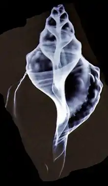 As an example in malacology, this X-ray of a marine snail shell shows the columella as the dense central spiral passing down the core of the shell.