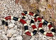 - Over 65 recognized species of New World coral snakes in three genera (Leptomicrurus, Micruroides, Micrurus), native to tropical South America and Southern USA, having bright bands of red, yellow and black.