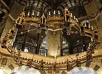 - A large, round, pendent chandelier, with spikes around its upper rim to hold candles or lamps, usually hung from the roof of a church.