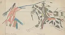 A piece of 1880s ledger art depicting a Cheyenne warrior on horseback (right) counting coup with a lance on a dismounted Crow warrior