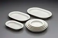 dishes, plates, and other tableware, usually made of some ceramic material used for serving food on and eating it from