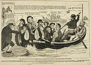 Charles Jameson Grant, The Ministers and Their Cronies off to Botany Bay, and the Dorchester Men Returning (1834–1835), a political cartoon depicting the Tolpuddle Martyrs—who had been sentenced to penal transportation to Australia after a labour dispute—returning to England following their pardon (background), and suggesting that government “ministers and their cronies” (foreground) should be sent there instead.